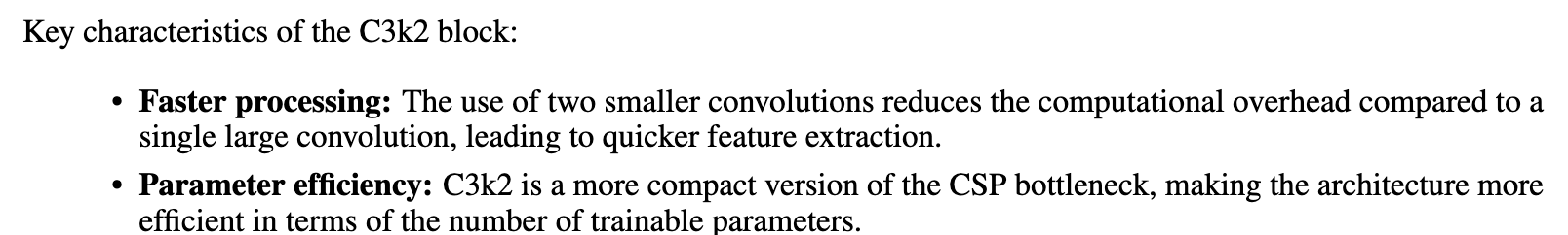 - C3k2는 기존의 C2f block을 대체 : 하나의 large convolution 대신 두 개의 작은 convolution을 통해 성능을 유지하면서 더 빠른 처리를 가능하게 한다.