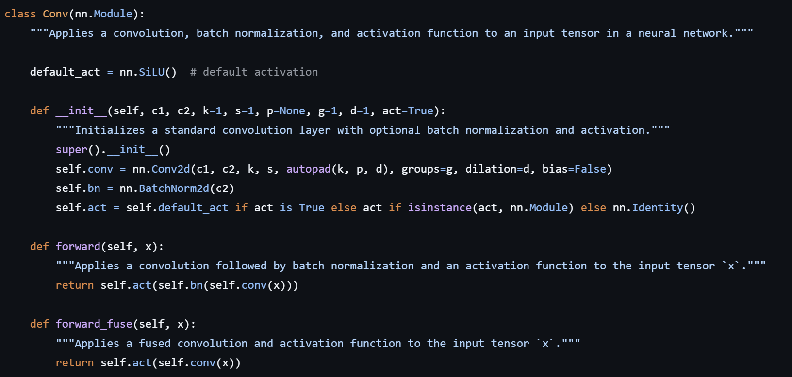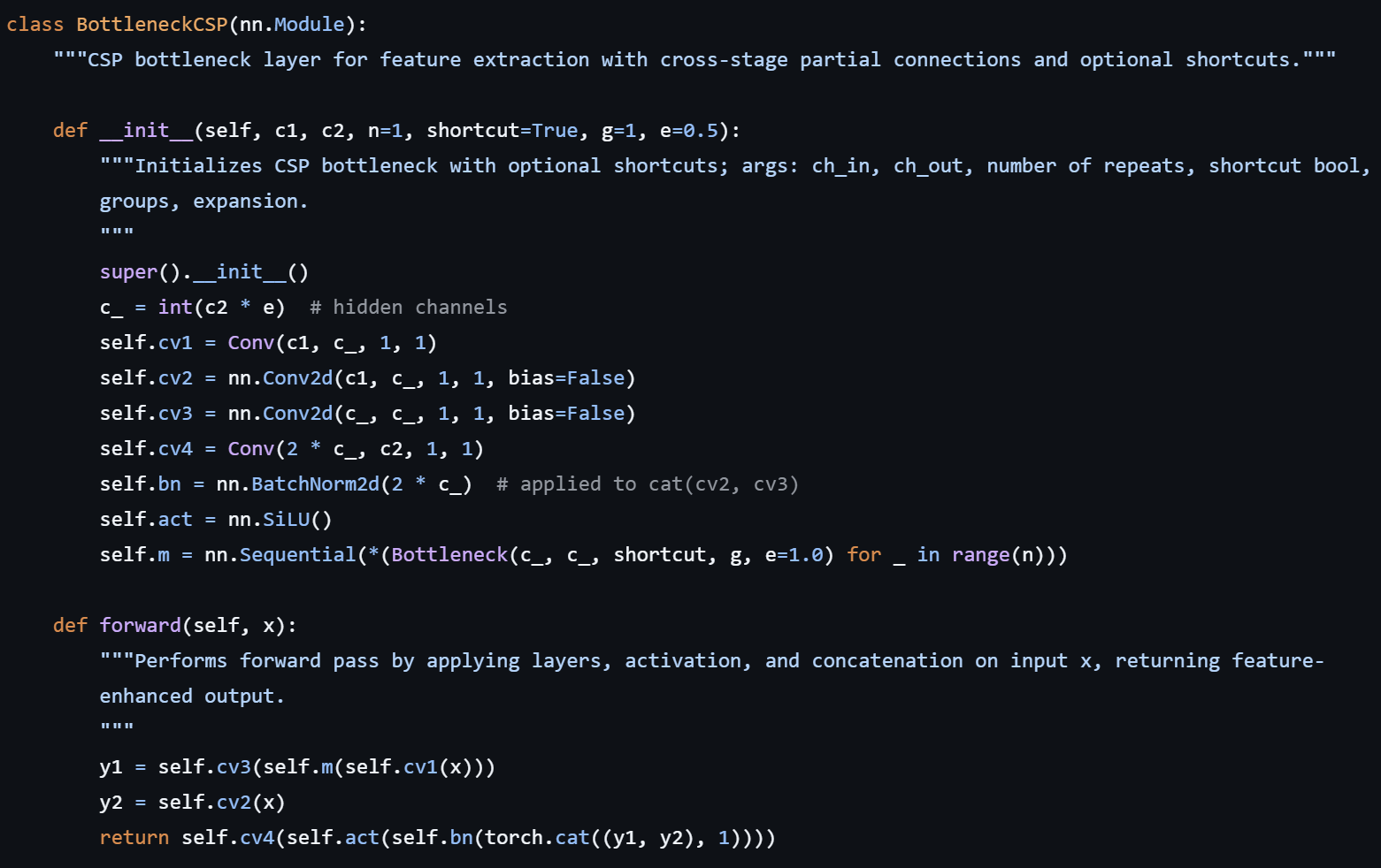 (YOLOv5's naming)) blocks : feature channel을 두개로 나눈후 하나는 heavy한 layers를 통과시키고 하나는 상대적으로 direct하게 유지시킨 후 다시 concatenate한다. (channel 차원은 1x1 convolution으로 맞춰줌) -> 이는 새롭게 정의한 autopad() 함수에서 실행됨