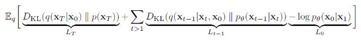 - 실험에서는 forward process의 분산 beta를 상수로 고정할 것이기 때문에 q에서는 학습되는 파라미터가 없어서 L_T는 상수이므로 무시할 수 있다. (학습할 parameter가 없어서 L_T를 Loss 값으로 사용할 수 없음)