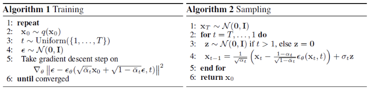 - 따라서 다음의 과정을 통해서 Training 되며 Sampling 되는 것을 알 수 있다. Training 하면서 epsilon_theta 값을 학습함.
