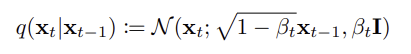 - 다음은 Forward 과정에서의 노이즈를 추가하는 방식이다. beta의 크기에 노이즈를 얼마나 추가할 지가 결정되며, beta의 값이 커질 수록 노이즈 값이 많이 추가되는 것을 알 수 있다. (beta 값은 주어진 상수)