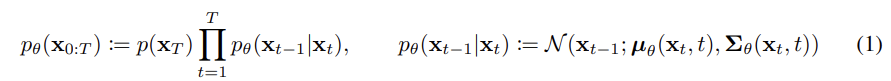 과 같이 정의한다. x1, x2, x_T는 데이터 x0 ~ q(x0)와 같은 크기이고 다음 P를 구하는 과정을 reverse process라고 하며 최종적으로 Pt는 완전히 가우시안 분포를 따른다.